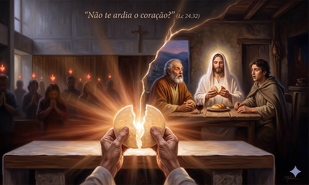 O reconhecimento acontece à mesa: “Tomou o pão, pronunciou a bênção, partiu-o e lhes distribuía. Então os olhos deles se abriram” (Lc 24,30-31). Na fração do pão, a tristeza se transforma em ardor. A Eucaristia é encontro real com Aquele que vive. Não é simples rito, mas presença que reacende o coração e reconstrói a comunhão.