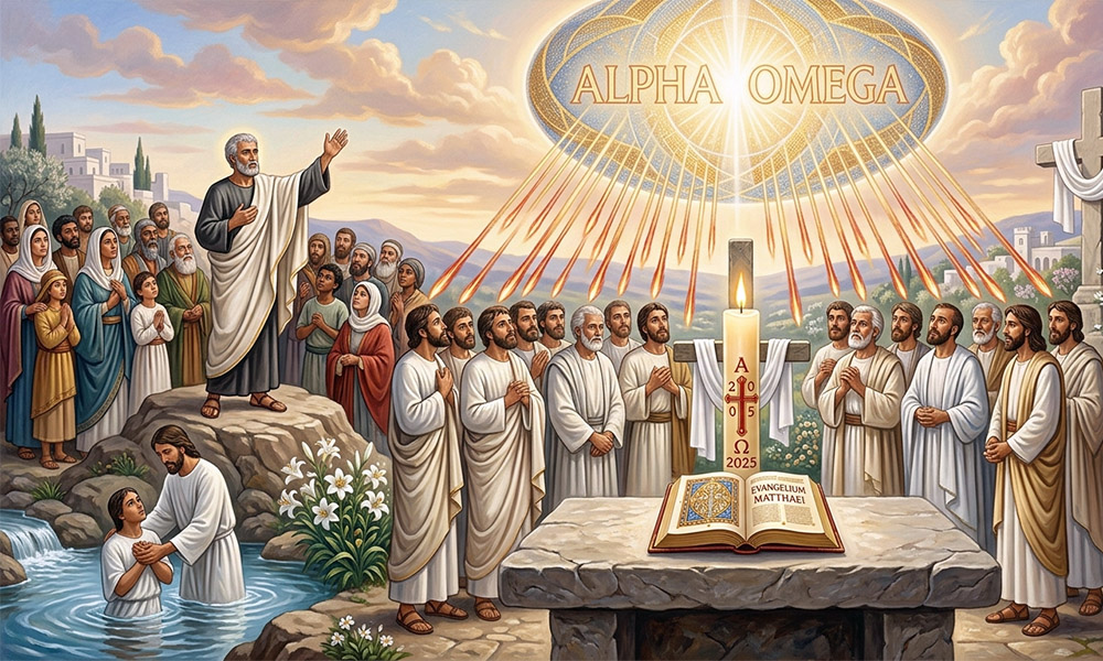No monte da Galileia, o Ressuscitado envia os discípulos a todas as nações, confiando-lhes o batismo e a evangelização e assegura sua presença até o fim dos tempos, para que também hoje, entre desafios e fronteiras, caminhemos com coragem missionária e confiança permanente.